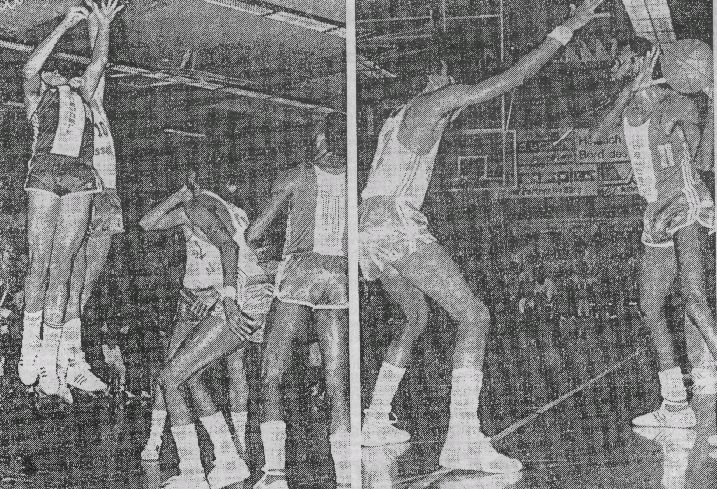 | Hart ging es zu unter den Körben Hier wird der FCler Peter Cole beim Rebound von Ralf Kuhtz (Nr. 10, halb verdeckt) nach unten gezogen, der Hagener Amerikaner Graylin Warner (zweiter von rechts) blockt Kennith Sweet ab (Bild links) Sie lieferten sich über 40 Minuten ein packendes Duell: Rechts FC-Kapitän Ken Sweet, links Graylin Warner, überragender Spieler beim SSV Hagen (Bild rechts) | ||